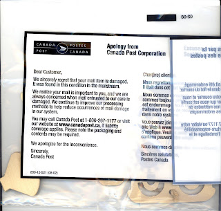 起先收到的時候滿臉遲疑,為什麼有一個那麼大的封套套住了這張木板明信片,只看見Canada Post說著在運送的過程中這張明信片受到損壞,希望我可以接受他們的道歉。仔細一看,真的有各角落的明信片好像是壓斷了,被一起放在封套裡。但是,到底是誰寄來的木板明信片呢?